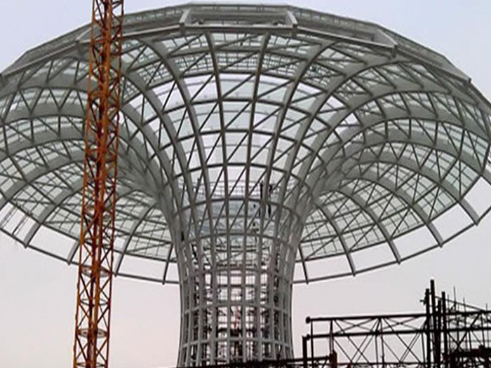 二、球形网架结构因其结构新颖,受力合理,自重轻、用钢量低等优点。如大型体育场馆球形海宁螺栓球网架、公共场馆球形网架、电厂海宁螺栓球网架、水泥工业球形网架、仓储物流球形网架、海宁干煤棚工业球形网架、海宁收费站海宁加油站球形网架、展览中心、影剧院、商场、航站楼、候车厅、工厂海宁车间、仓库、电视塔等球形螺栓球节点网架。国内球形网架结构主要分为:海宁焊接球节点网架及螺栓球节点网架两种。螺栓球节点网架其构件工厂内加工量较大,现场安装便捷,适用于现场工期紧,海宁施工条件、用电量受制约,网架形状复杂、海宁杆件定位困难的异形结构。螺栓球节点球形网架系统基本由海宁杆件、螺栓球、支撑支座等组成。按照节点形式可分为交叉海宁桁架体系、四角锥体系、三角锥体系等。支撑方式多为固定支座支撑。对于大面积、大跨度及有特殊受力或伸缩要求的网架结构可采用橡胶支座、滑移支座、球铰支座等支撑形式,以满足结构自身的受力稳定、均衡,便于内力释放等设计要求。